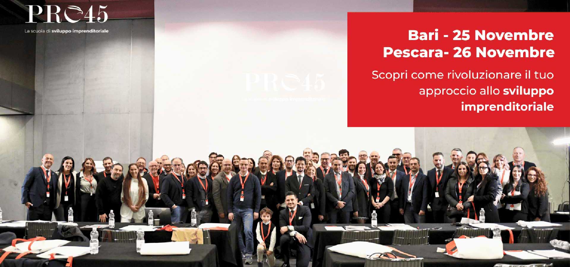 Il Mastery Day di Pro 45 è l’unico evento GRATUITO in cui imprenditori veri, che vivono il mercato ogni giorno, ti daranno strategie pratiche per cambiare davvero il futuro della tua azienda.